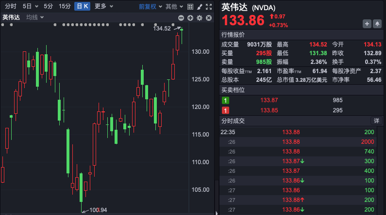 芯片股备受关注。经历了一波“五连涨”之后, 今晚英伟达继续高开,截至发稿涨幅为0.73%。