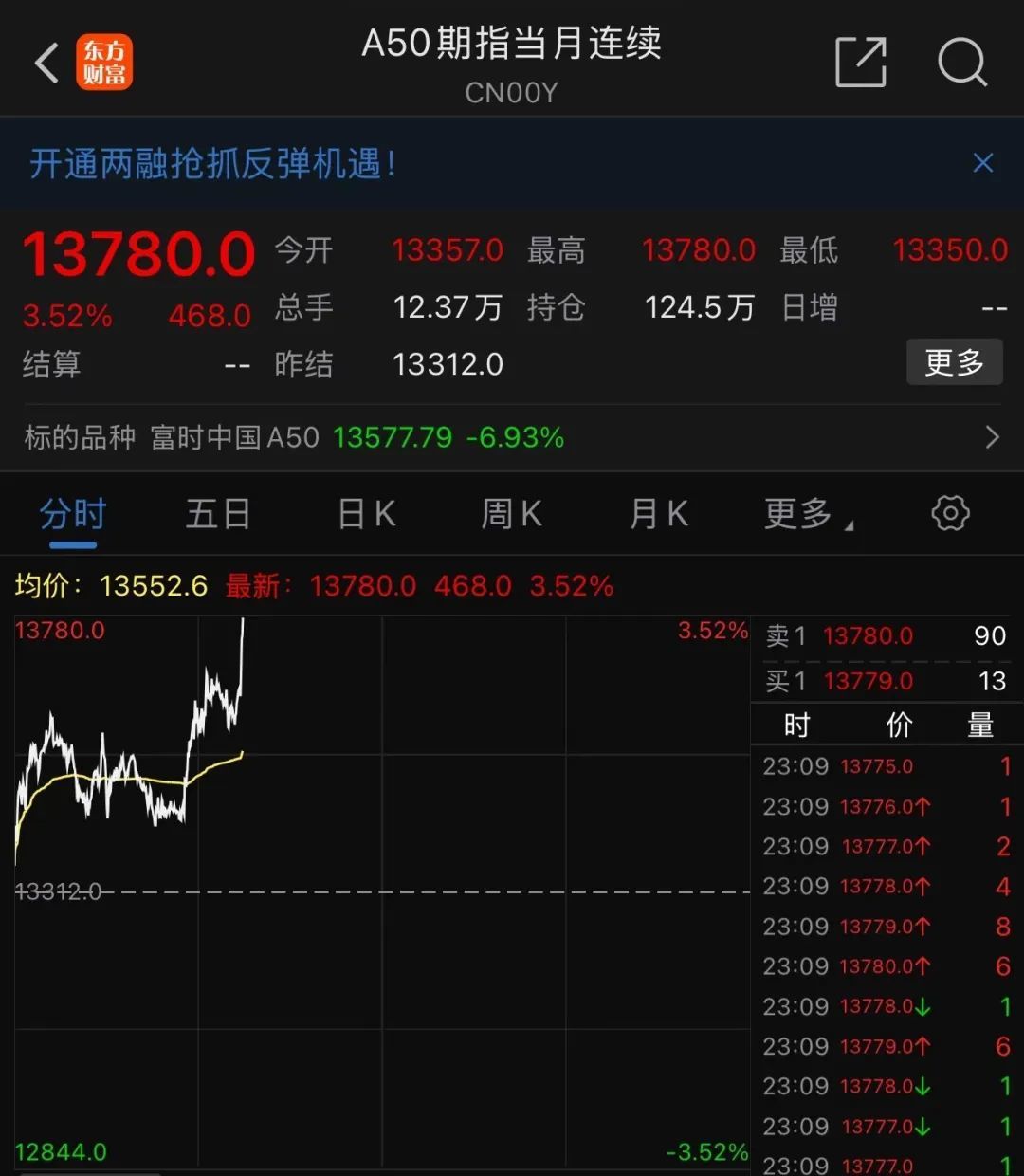 中国A50期货指数在富时停止下跌。截至发稿,涨幅为3.52%。
