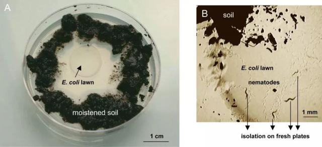 培养皿中间的大肠杆菌体,周围一圈是黑色的,含有美丽的隐杆线虫土壤样品。(A);以细菌为食的线虫被食物吸引,比如从土壤中钻出来,挑出这些活性线虫的个体,进行下一代的繁殖。(B)丨 Antoine Barri è re & Marie-Anne F é lix / wormbook.org