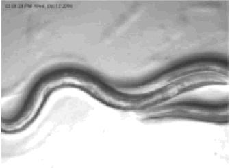 与身长相比,可达 30 一厘米的面条蛔虫,美丽的隐杆线虫可谓娇小,成熟的个体只不过是 1 mm长,头尾尖长,中间一段可随意弯曲圆柱体。它的名字是 Caenorhabditis 其中包含“杆状”字根。(rhabditis),而种原名 elegans 意思是“美丽,优雅”。看看美丽的隐杆线虫。一般的正弦波运动方式,你可能会明白这只透明无色的“虫子”是如何得到这个名字的。另外,与蛔虫不同的是,美丽的隐杆线虫是非寄生线虫。