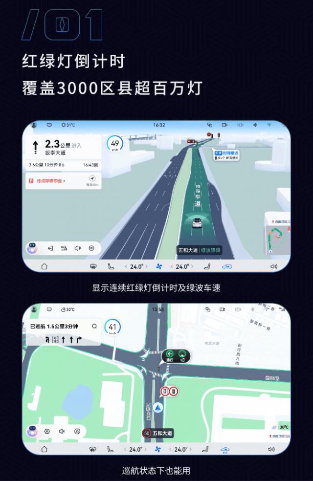 红绿灯倒计时,覆盖 3000 区县超过百万盏灯,支持连续红绿灯倒计时和绿波速度的显示,同时巡航条件下可以使用