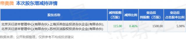 证券之星消息,10 月 9 《帝奥微》日帝奥微发布公告 : 股东减持股份结果公告,其股东北京沃衍资本管理中心 ( 有限合伙 ) - 上海沃燕风险投资合伙企业 ( 有限合伙 ) 、北京沃衍资本管理中心 ( 有限合伙 ) - 苏州沃洁股权投资合伙企业 ( 有限合伙 ) 于 2024 年 10 月 1 日到 2024 年 10 月 9 白日合计减持 115.0 万股,目前占据公司总股本 0.456%,股票在变化期间上涨。 4.95%,截至 10 月 9 日收盘报 20.78 元。