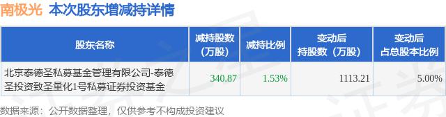 证券之星消息,10 月 9 南极光发布公告《南极光》 : 简单的权益变动报告 ( 泰德圣 ) 》,其股东北京泰德圣私募基金管理有限公司 - 泰德圣投资致圣量化 1 私募股权投资基金 2024 年 1 月 26 日到 2024 年 10 月 9 白日合计减持 340.87 万股,目前占据公司总股本 1.531%,股票在变化期间下跌 17.7%,截至 10 月 9 日收盘报 13.81 元。