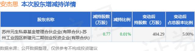 证券之星消息,10 月 9 安杰思发布公告《安杰思》 : 关于仓位的安杰思 5% 上述股东减持股份至 5% 权益变动提醒公告,其股东苏州元生私募基金管理合伙企业 ( 有限合伙 ) - 苏州工业区新建元二期风险投资企业 ( 有限合伙 ) 于 2024 年 9 月 9 日到 2024 年 10 月 8 白日合计减持 0.77 万股,占公司当前总股本的一万股。 0.0095%,股票在变化期间上涨。 36.68%,截至 10 月 8 日收盘报 68.0 元。