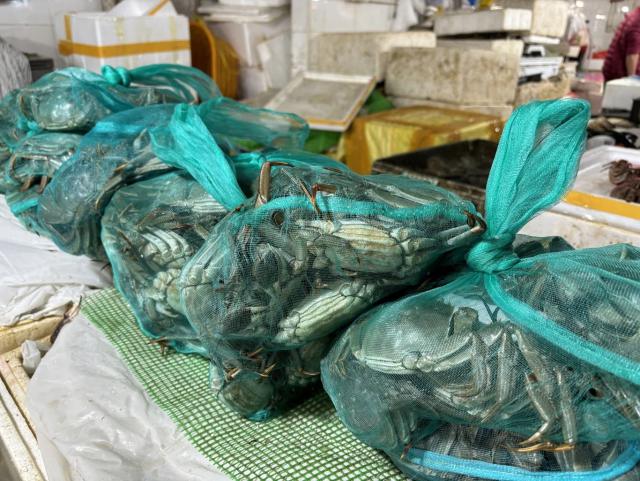 10 月 9 一天早上,记者来到人乐市场,看到水产品摊位上摆放着一袋袋大闸蟹。摊主拿出几个放在盆里,一只大闸蟹咧着嘴笑,充满活力,很多市民来买。“现在大闸蟹挺壮的,比前几天便宜很多。他们买了一些回家蒸的,家人都很喜欢。”李先生一边挑螃蟹一边说。