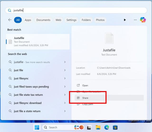 在任务栏输入框中显示的搜索结果中,微软表示用户可以直接共享文件。
