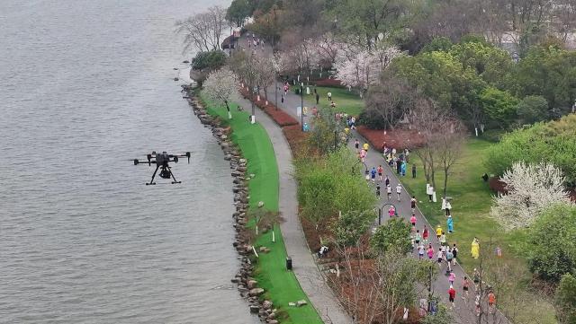 今年 3 月,为确保武汉马拉松赛事安全顺利进行,东湖公安利用部署在各点的警用无人机自动机库,在东湖绿道赛段和比赛终点精细检查跑道和沿线道路,守护“汉马”最美跑道。借助无人机的高空角度,比赛现场指挥中心可以实时查看比赛进度和跑道周边情况,形成可视化指挥和精准调度,快速发现并及时处理跑道内外突发情况。