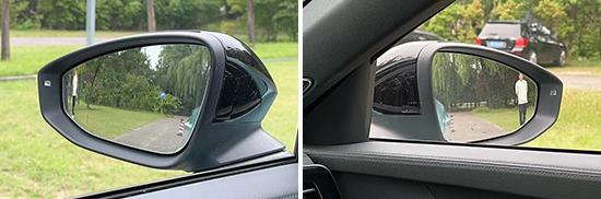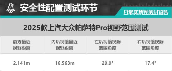 2025 上汽大众帕萨特 Pro 左外后视镜采用双曲率镜片,右外后视镜为普通镜片。经实际测量,左外后视镜的视野范围为 29.9 °,同级别车型测试后处于上游水平;右外后视镜的视野范围为 17.4 °,测试过的同级别车型处于中下游水平。