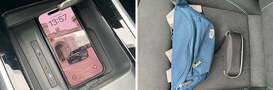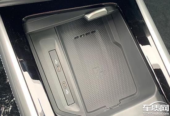 评估车在前杯架前部配置 1 手机无线充电板,位置设计合适,取放方便。同时,手机的无线充电板还配有排热通风孔,支持开启和关闭。