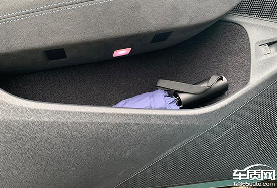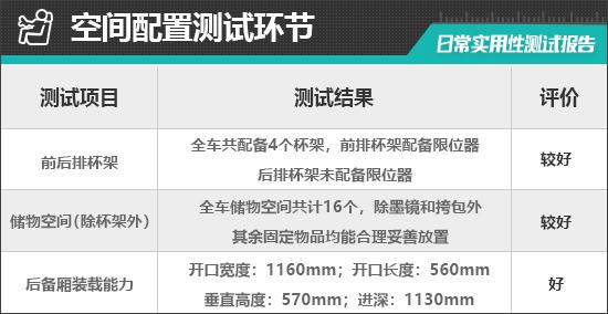 对车内使用空间的检测,仅针对前排触手可及的空间,不包括需要启动的空间,如手套箱、中央扶手箱等。测试方法是将以下所有固定物品放置在前排的每一个储物空间中,通过固定物品的放置状态来判断车辆储物空间的性能。检验选定的固定物体如下:2 一瓶常规大小的矿泉水, 大屏幕手机,1 支口红、1 个挎包、1 副墨镜、1 把折叠伞和 1 包装常规尺寸的抽纸。