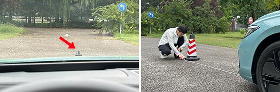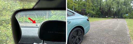 在后视线检测中,桩桶仍然固定放置,然后移动车辆,直到可以观察到桩桶的上缘。经过实际测量,后视线测得的距离是 在测试过的同级别车型中,16.563m处于下游水平。