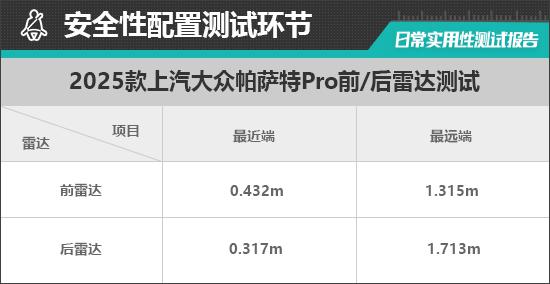 倒车雷达在测试过程中 1.713m 后面的物体可以在任何地方感应到,雷达的功率表现也相当令人满意。根据以往的检测经验,持续蜂鸣阶段越接近 0.25m 更接近日常使用习惯。根据实测数据,2025 上汽大众帕萨特 Pro 倒车雷达持续蜂鸣提醒距离为 0.317m,与测试经验有一定差距。