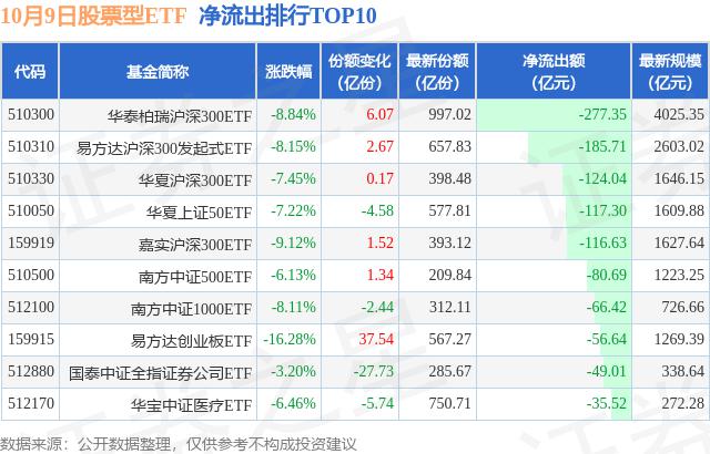 当天有 606 只股票型 ETF 资金出现净流出,其中华泰柏瑞沪深深排名第一。 300ETF(510300)减少了份额 6.07 一亿份,净流出额为 277.35 亿元。