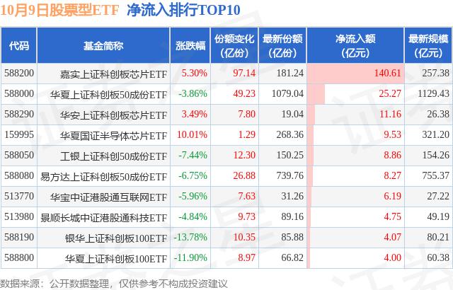 当天有 118 只股票型 ETF 资金净流入,其中嘉实上证科技创新板芯片净流入排名第一。 ETF(588200),份额增加 97.14 十亿份,净流入额为 140.61 亿元。