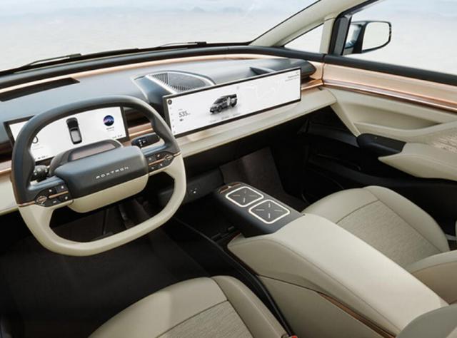 车内提供双辐多功能方向盘、悬浮仪表屏、中控屏、副驾驶娱乐屏,整体内饰布局豪华感和科技氛围良好。