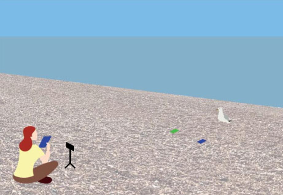 研究人员把绿色和蓝色两个包装袋的薯条放在海边的一个开阔的地方,让银鸥看到。然后安排一个人坐在几米外的地上,ta要么坐着拍照,要么从包里拿出一袋薯条吃。