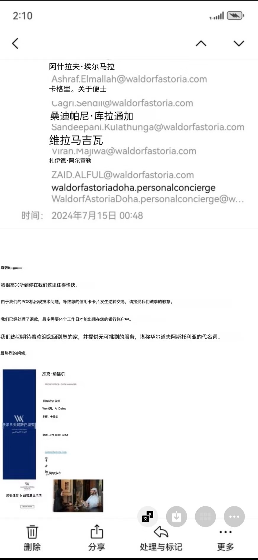 最近,客户张先生向澎湃公众互动平台“服务”(www.tousu.thepaper.cn)体现, 7月7日至12日,他入住卡塔尔多哈西湾华尔道夫阿斯托利亚酒店。退房时,由于POS系统问题,他支付了约2.9万元的双倍房费。我联系过酒店几次要求退款,但还是没有收到退款。