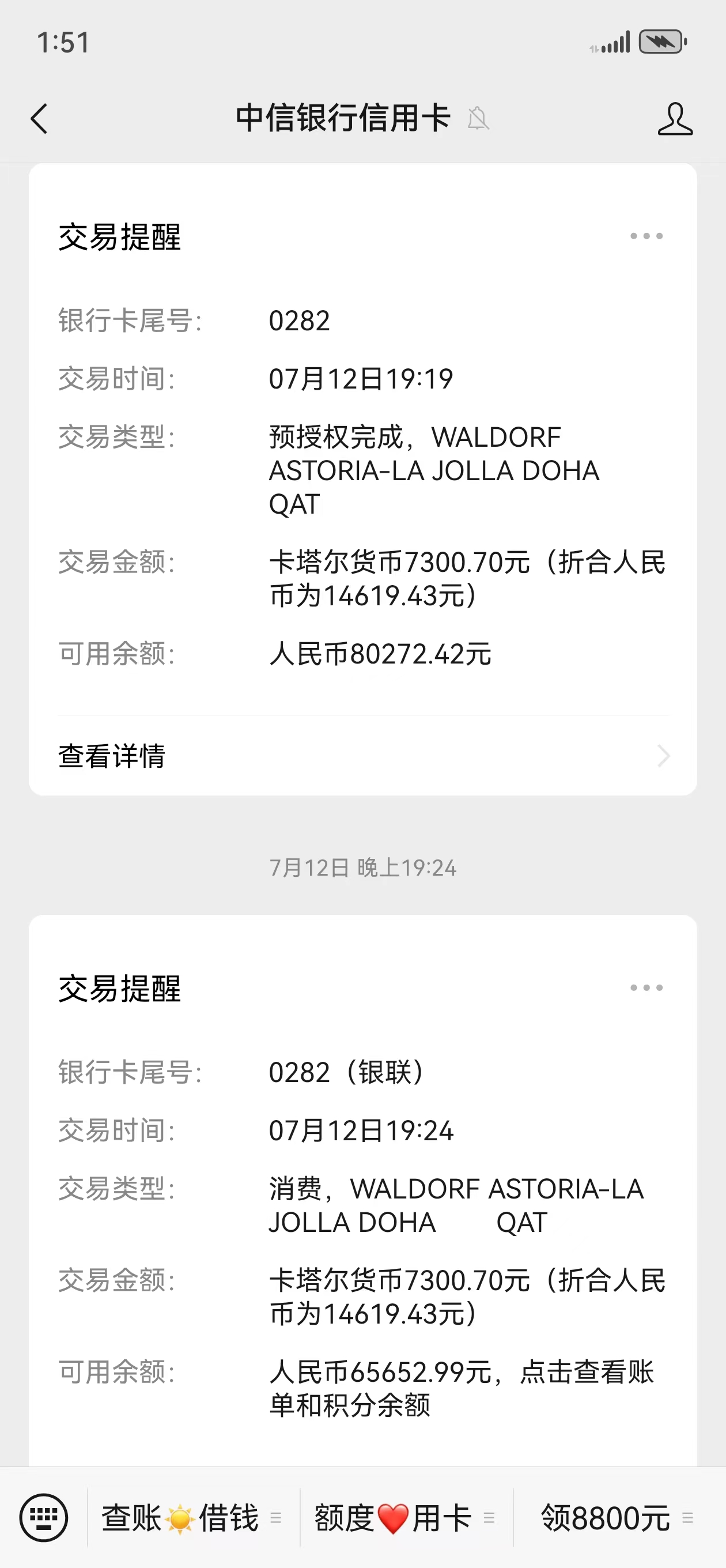 然而,当张先生回到中国向中信银行核实交易时,他发现自己确实被扣除了双倍的房费。张先生提供的银行流水截图显示,实际交易确实是几笔14619.43元的酒店客房费。