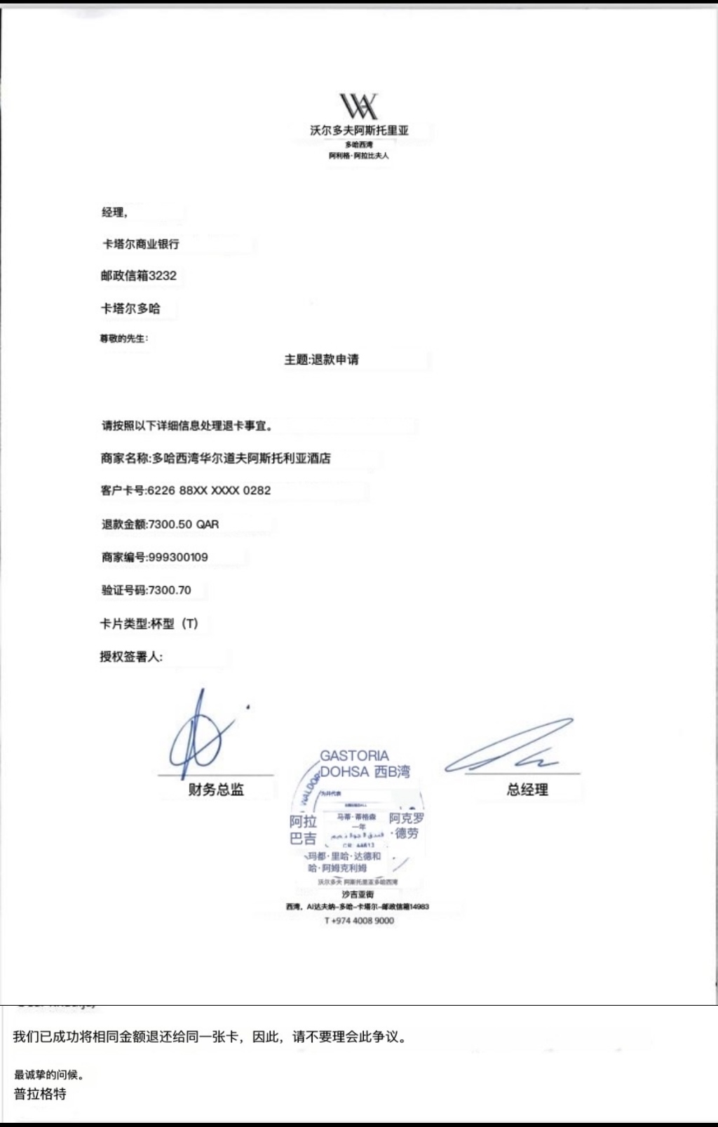 十月四日,ThePaper向卡塔尔多哈西湾华尔道夫阿斯托利亚酒店发送邮件,询问退款情况,截至发稿前未得到回应。