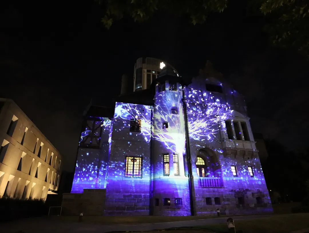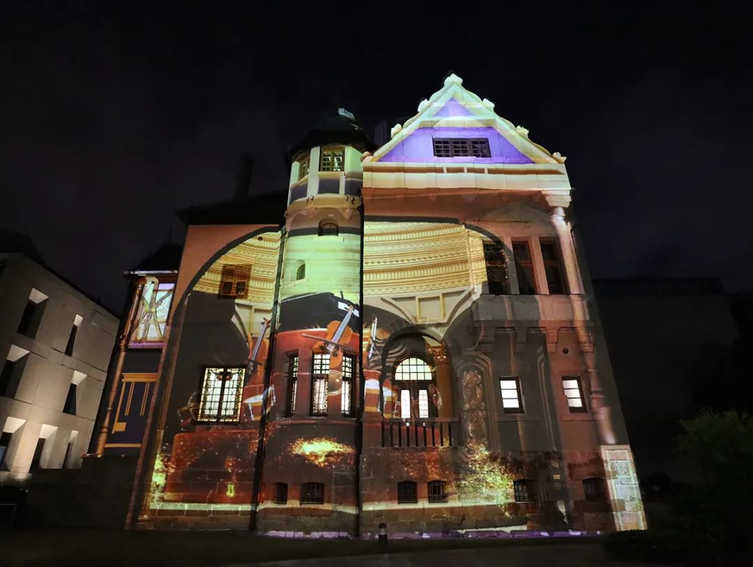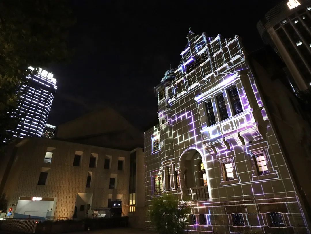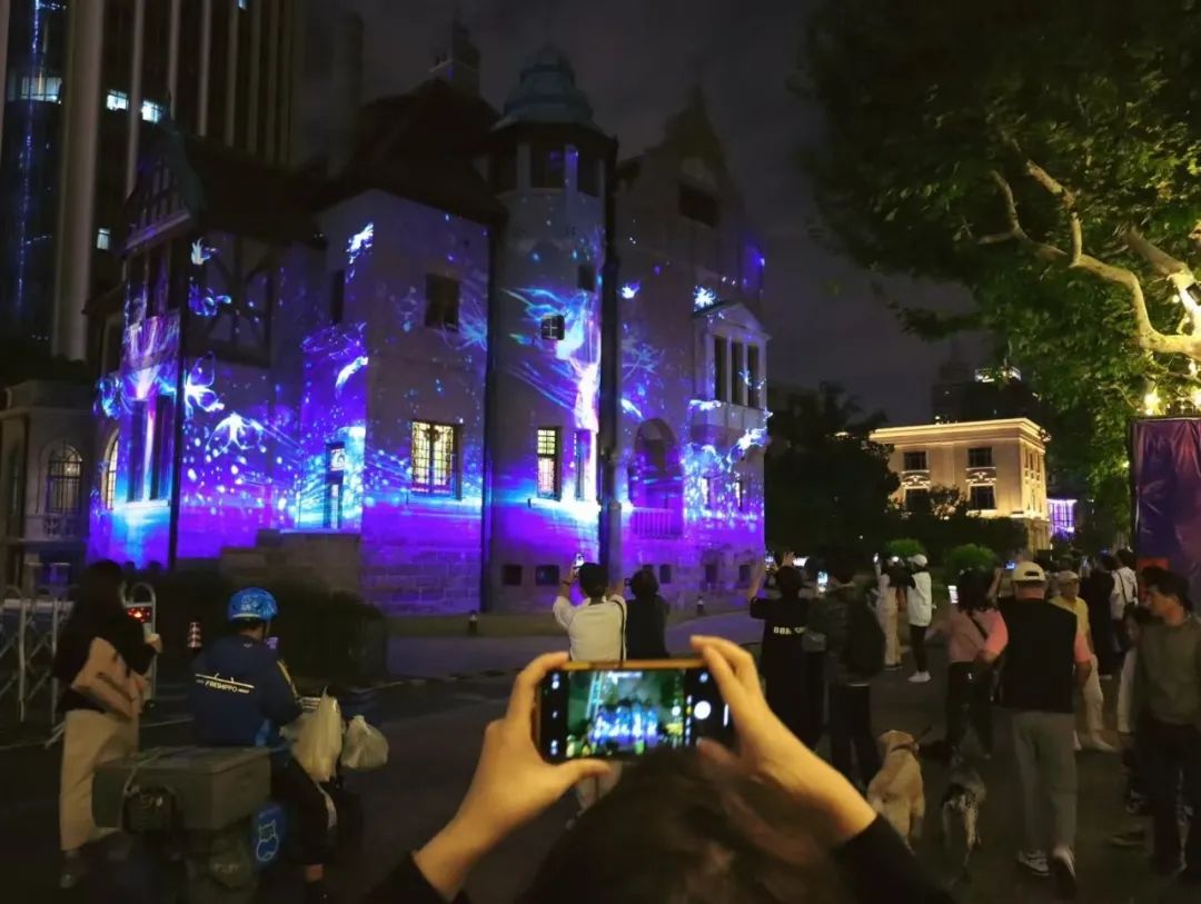 上海音乐学院的“音乐城堡”华丽变身。伴随着《我的人民,我的国家》悠扬的旋律,美丽的光影幻化出各种各样的图案,让音符在工程之上快乐地弹跳。