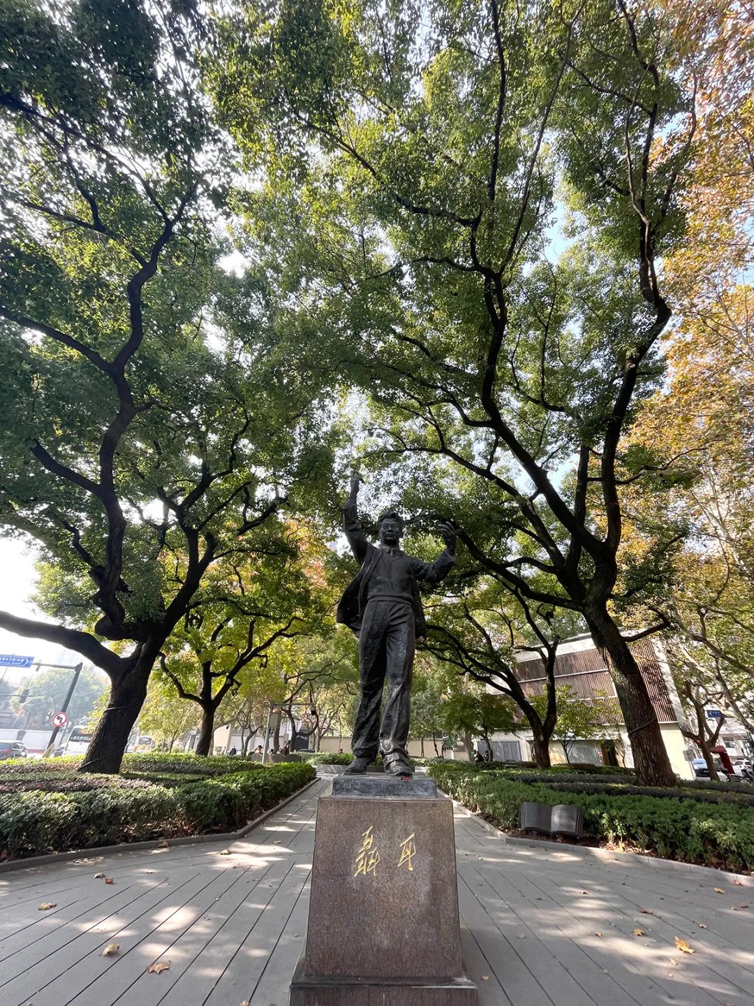 这场音乐漫步的高潮就在这座名为《起来》的聂耳铜像前面。这是张充仁晚年在中国雕塑家中完成的一件城市雕塑,1992年被重工。聂耳双手向上抬起,左手张开,左手半握,食指指向天空。这个动作是聂耳指挥乐队演奏《义勇军进行曲》时的经典形象。