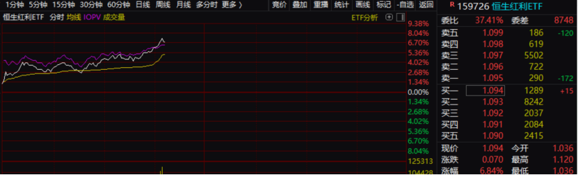 与此同时,港股市场也迅速上涨。恒生国有企业指数上涨至4%,恒生指数上涨3.5%。房地产股迅速上涨,龙湖集团上涨近13%。富时中国A50指数期货也一度上涨超过6%。恒生红利ETF疯狂接近7%。