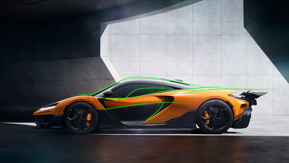 另一条向下的线条是描述气体绕过挡风玻璃后的形状,而黑色部分是气流绕过车轮后的形状。两股气流最终聚集在门后,以迈凯伦为目标。 logo 大风道中的灵感设计。