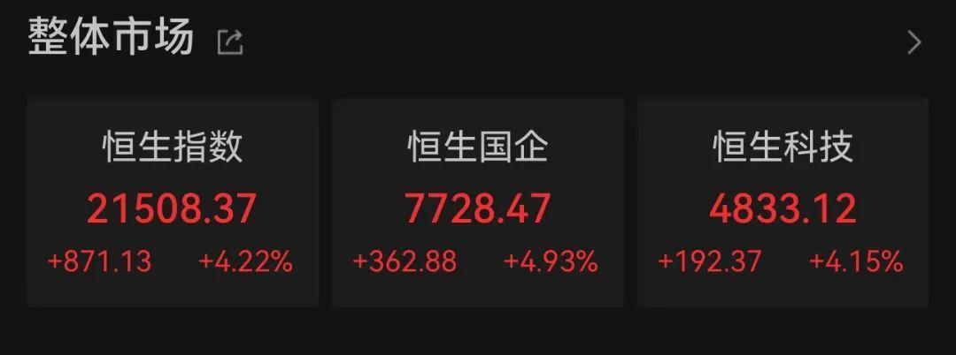 同时港股也爆发,恒生指数上涨4.22%,恒生科技指数上涨4.15%。