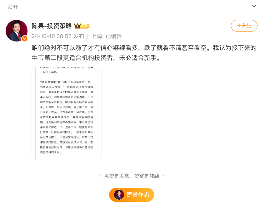 10月10日,中信建投证券首席策略官、董事总经理陈果表示,为了继续看到更多的信心,我们绝不能上涨。如果我们下跌,我们将看不清楚甚至看不起它。他认为接下来的牛市第二段更适合机构投资者,不一定适合初学者。