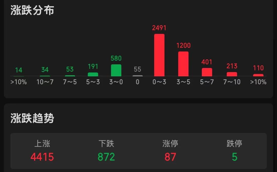 截至午盘,市场股票呈上涨、下跌的趋势,4415只股票价格上涨,872只股票价格下跌。在这些股票中,有87只涨停股和5只跌停股。