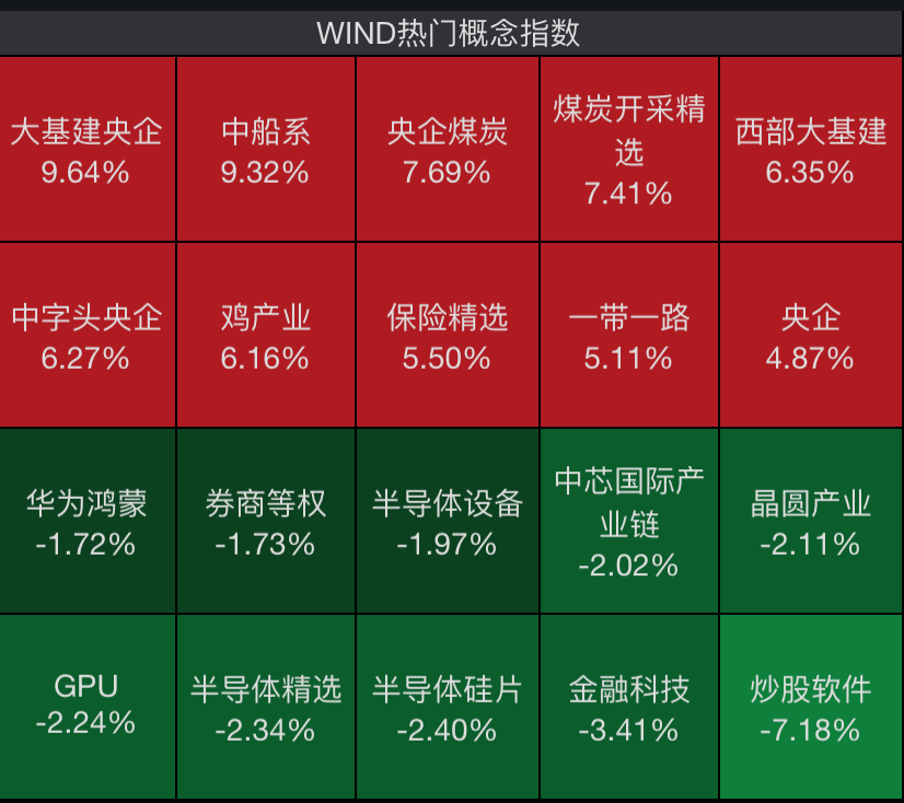 风力发电设备、煤炭开采加工、轨道交通设备、水产养殖、银行、物流、保险、中船系、中字头股等板块涨幅居前;多元化金融、证券、半导体等板块逆势下跌。