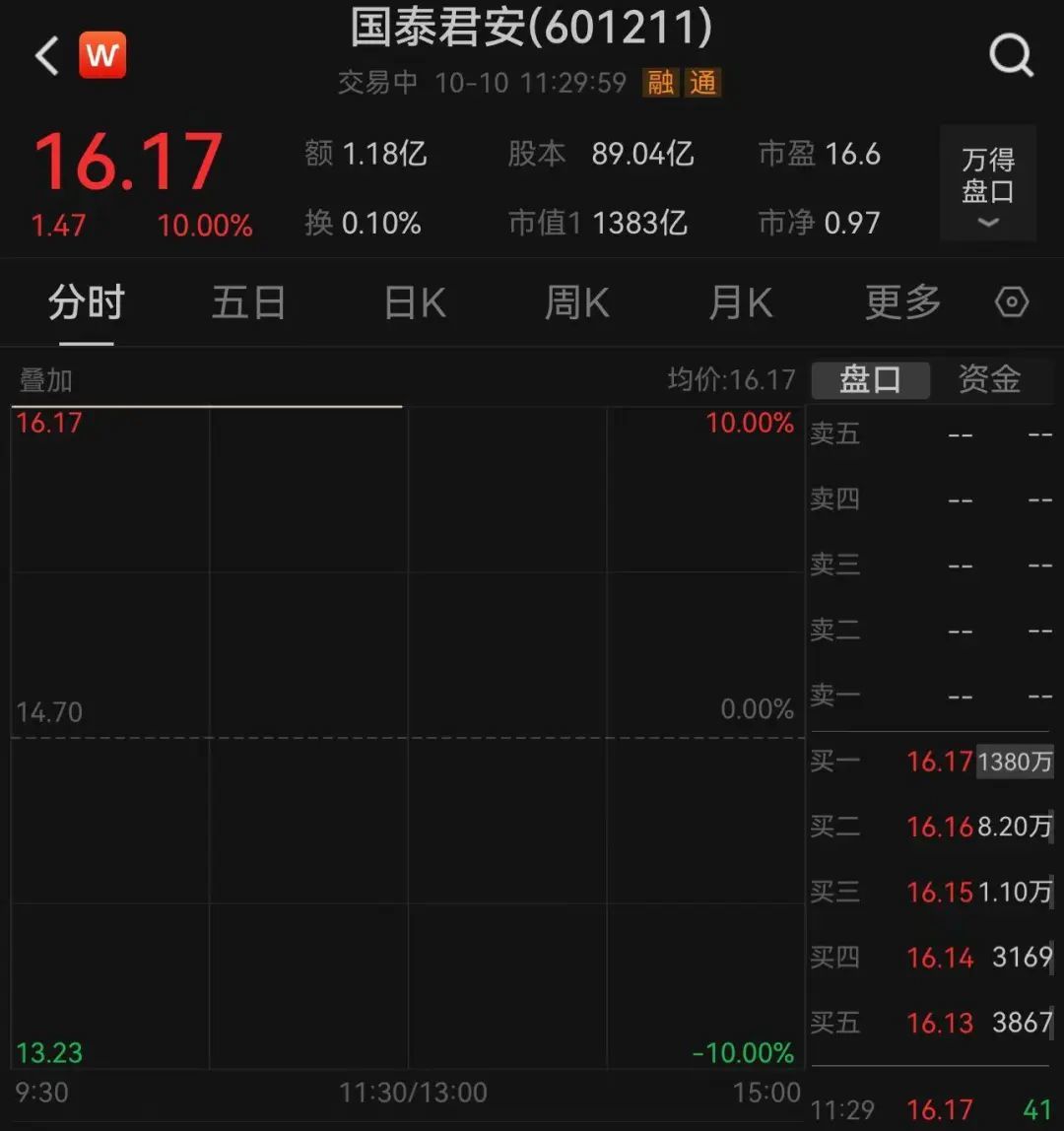 10月10日,国泰君安、海通证券a股在宣布交易条款并复牌后,在电话拍卖阶段没有悬念涨停,截至中午收盘时仍保持涨停。