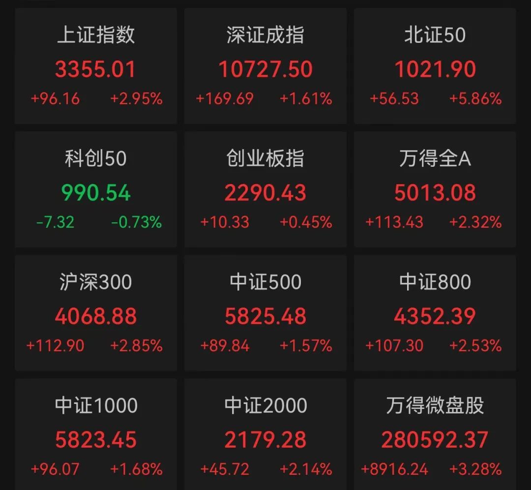 十月十日开盘,a股市场发生了很大变化。a股首先开盘小幅上涨,然后回落转跌,一度下跌2.97%,在接近10日中午收盘时,三大指数迅速上涨翻红,截至中午收盘,上证综指上涨2.95%,报3355.01点;深证指数上涨1.61%,报10727.50点;创业板指数下跌超过4%,上涨0.45%,上涨2290.43点。