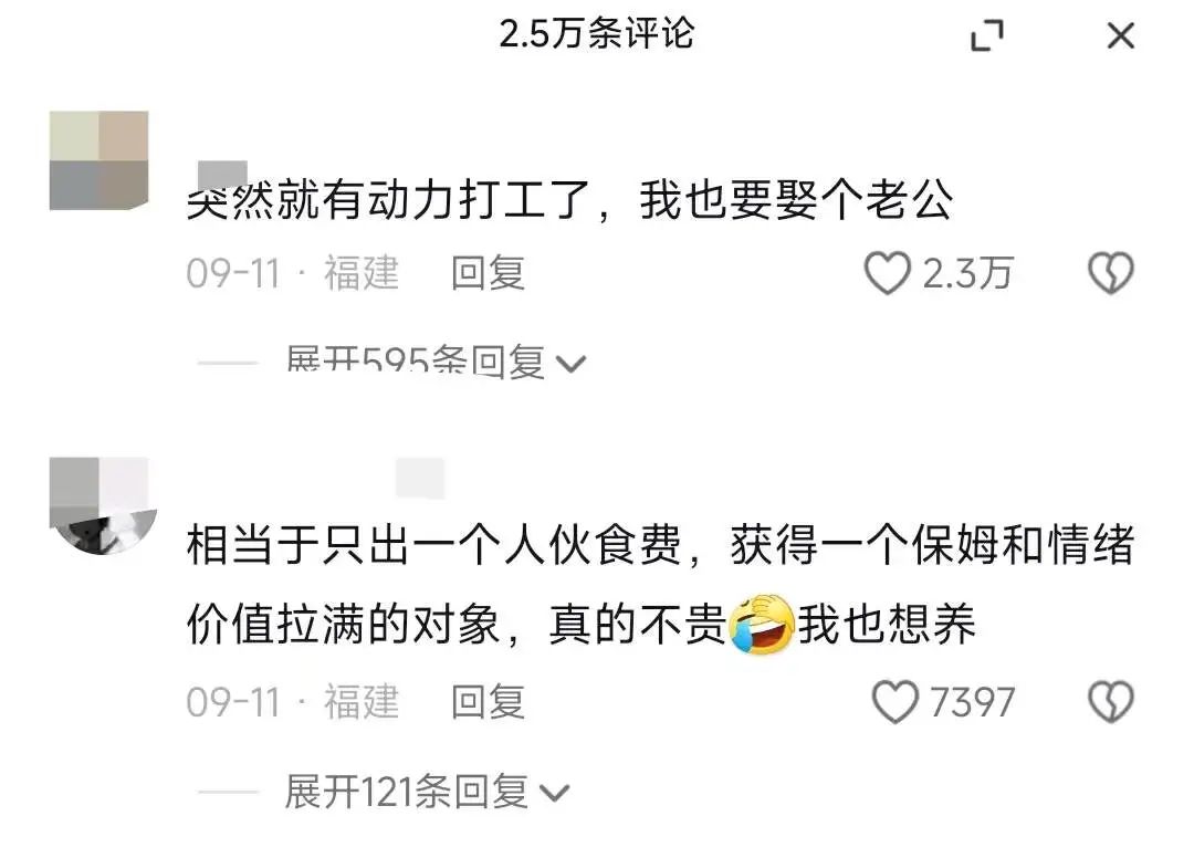 值得注意的是,软饭男不等于舔狗。很多网友认为,“突然范特西”之所以愿意尽可能细致地照顾妻子的情绪,一个非常重要的原因是妻子在他最困难的时候帮助了他,愿意帮助丈夫分担家务。“突然范特西”软饭男的生活,其实是两人共同努力的结果。
