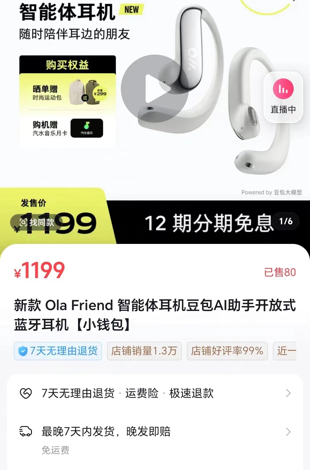 十月十日,首款AI智能体耳机Ola发布于字节跳动 Friend,这是一款单耳6.6克的开放式耳机。这款耳机连接到字节跳动的大豆包模型,并与豆包APP相结合。戴上耳机后,顾客可以通过语音唤起豆包进行对话,无需打开手机。