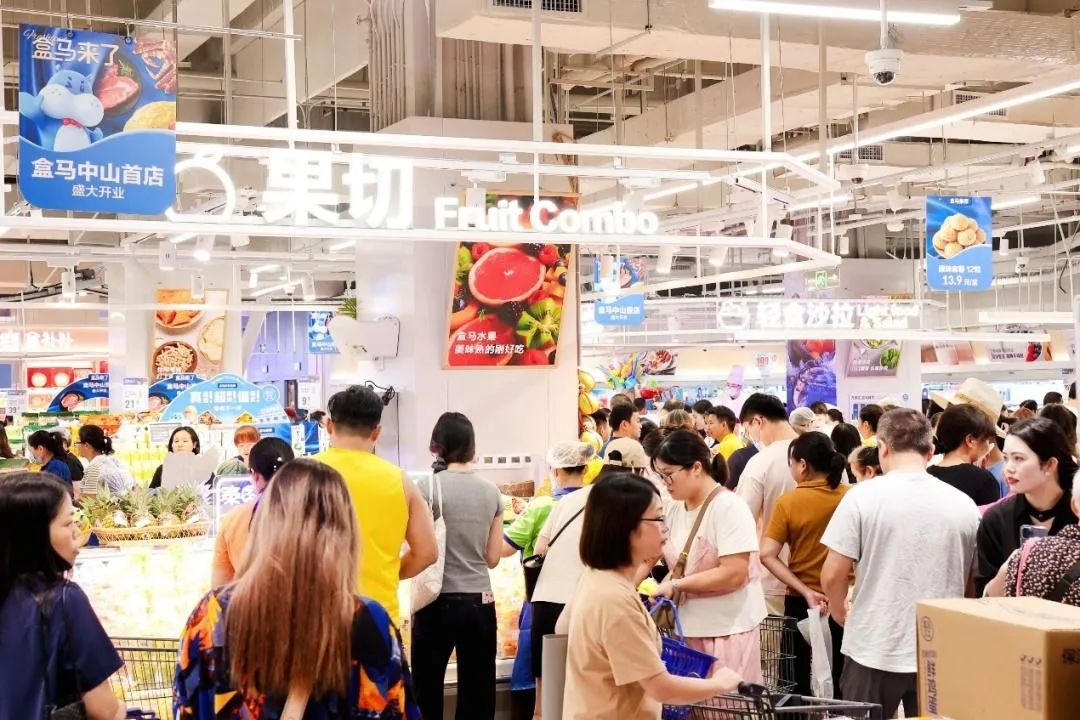 盒马广东中山首店在国庆前开张,国庆七天假期都在排队限流入店内。