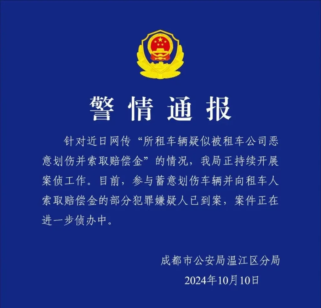 10月10日,四川省成都市公安局温江分局发布警方通报称,该局正在继续开展案件调查工作,针对近期网上“租赁车辆疑似被租赁公司恶意划伤并索要赔偿”的情况。