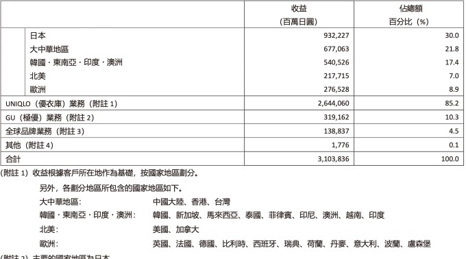 在海外UNIQLO(优衣库)工作分部方面,本财年收入总额为17118亿日元,同比增长19.1%,经营溢利总额为2834亿日元,同比增长24.9%。 在这些地区,大中华地区的年收入为6770亿日元,同比增长9.2%,经营溢利为1048亿日元,同比增长 0.5%。按照当地货币计算,中国大陆和香港的市场收入增加了,但是经营溢利减少了。