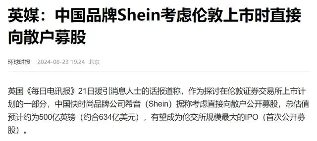 不久前,《环球时报》引用外媒称,希音前往美国的IPO计划停滞不前,估值约634亿美元,准备在英国上市时向散户募集股票。