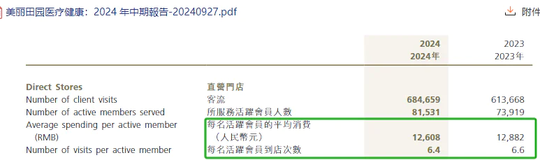 比如美丽的田园医疗健康(02373.HK),主要从事生活美容和医疗美容业务,收入分别为55%和39%。根据2024年上半年的财务报告,虽然客流和活跃会员人数都在10%左右上升,但平均交易量和活跃用户平均进店频率却在下降。最终医疗美容业务实现收入4.41亿元,同比仅略有增长0.3%。
