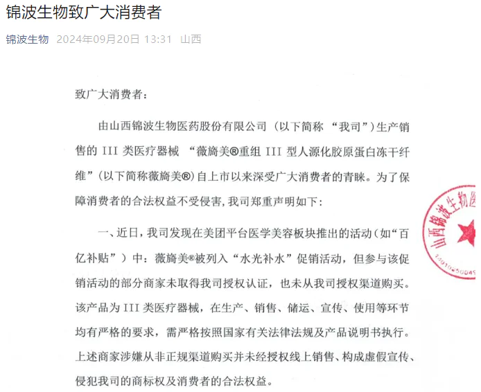 例如医疗美容上游厂商锦波生物(832982.BJ)今年9月,官方微博《致消费者》一文提到,“薇美在美团平台医疗美容板块推出的‘百亿补贴’活动中被列为‘水光补水’营销活动,但部分参与本次促销活动的商家未取得我公司授权认证,也未从我公司授权渠道购买。”