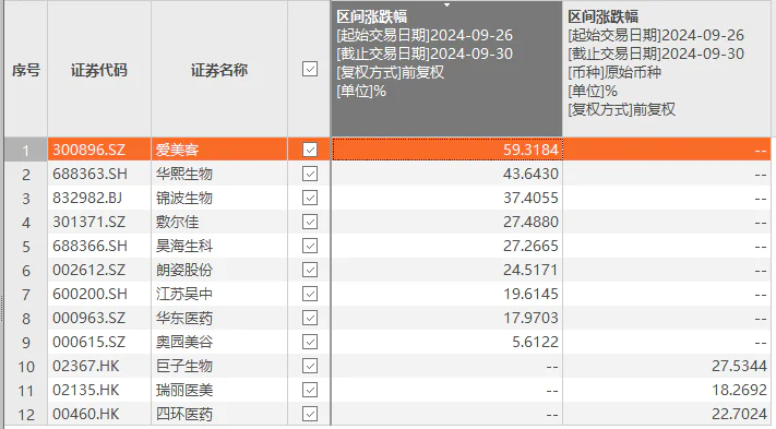 根据Choice的数据,9月26日至30日期间,医美龙头爱美客、华熙生物、锦波生物等目标区间涨跌59%。、其他医美标的涨幅大多在15%-30%之间,43%和37%。