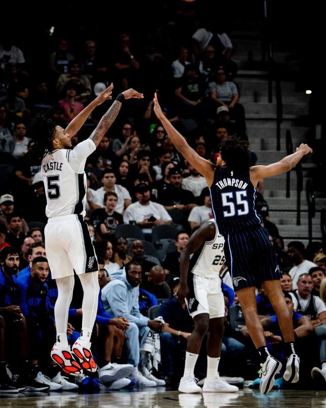马刺 4 号秀卡斯尔首秀打了 18.5 分钟,3 投 2 中,罚球 2 中 1,获得 5 分 2 板 3 助 6 失误;次战 21.8 分钟,9 投 4 中,三分 5 中 2,罚球 10 中 7,拿到 17 分 2 板 4 助 2 断 1 失误。场均 11 分 2 板 3.5 助 1 断 3.5 错误,三个准确率:50%,40%,66.7%。
