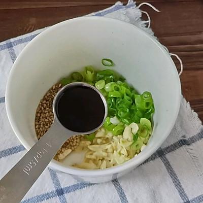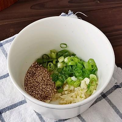 2、将葱切成小块,将蒜切成蒜末放入碗中,然后加入其中。 1 勺子芝麻,倒少量滚油。