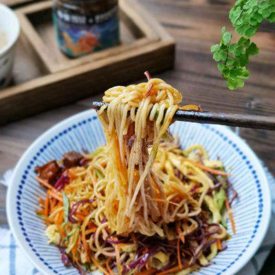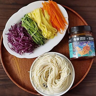 1、黄瓜子,胡萝卜,紫甘蓝切丝,鸡蛋打散,摊成蛋饼也切成丝备用。