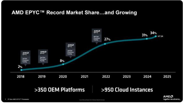 AMD 公司 CEO 苏姿丰称,Turin 该芯片的性能将超过最新的英特尔芯片。自推出以来,AMD 的 EPYC(霄龙) CPU 已经占据了服务器领域 34% 市场份额,远高于 2018 年里的 2%。