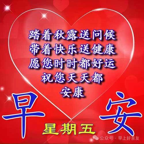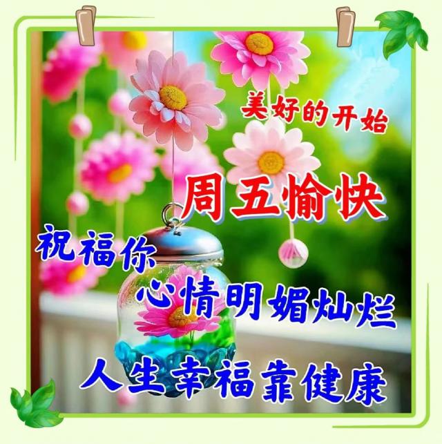 早上好!每天早上都是人生的新起点。愿你的健康像日出一样美丽,幸福像微风一样清新,安全像地面一样稳定,快乐像鸟儿的歌声。星期五早上好!