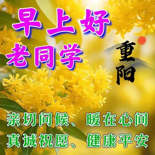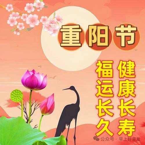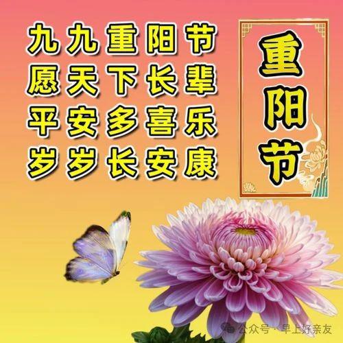 重阳老了,现在重阳老了。不要辜负这个幸运的日子。心存感激,尊重老人,孝顺父母,表达自己的真挚感情,感受传统民俗的多彩浪漫。吃一顿团圆饭,享受温暖;喝一杯菊花酒,祈求灾难;品一块重阳糕,一步一步往上爬。早上好,吉祥!