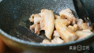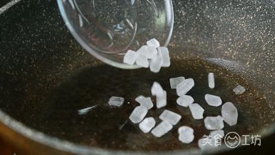 3. 起油锅,冰糖炒成糖色,加入猪肉翻炒着色,再加入酱油,酱油,米酒炒匀。
