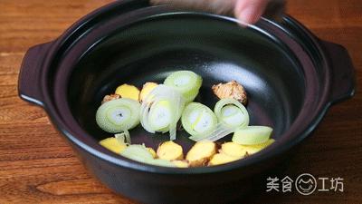 4. 将葱、姜片、八角、桂皮放入砂锅中,码入炒至上色的猪肉。